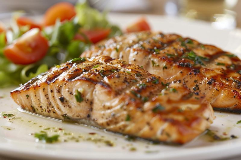 Almoço | 2 filés de peixe grelhado com molho de iogurte, 100g de batata broa assada, salada de rúcula, alface roxa, alface americana, tomate cereja, pepino fatiado, cenoura ralada, beterraba crua, frutas secas com molho de mostarda e mel |
